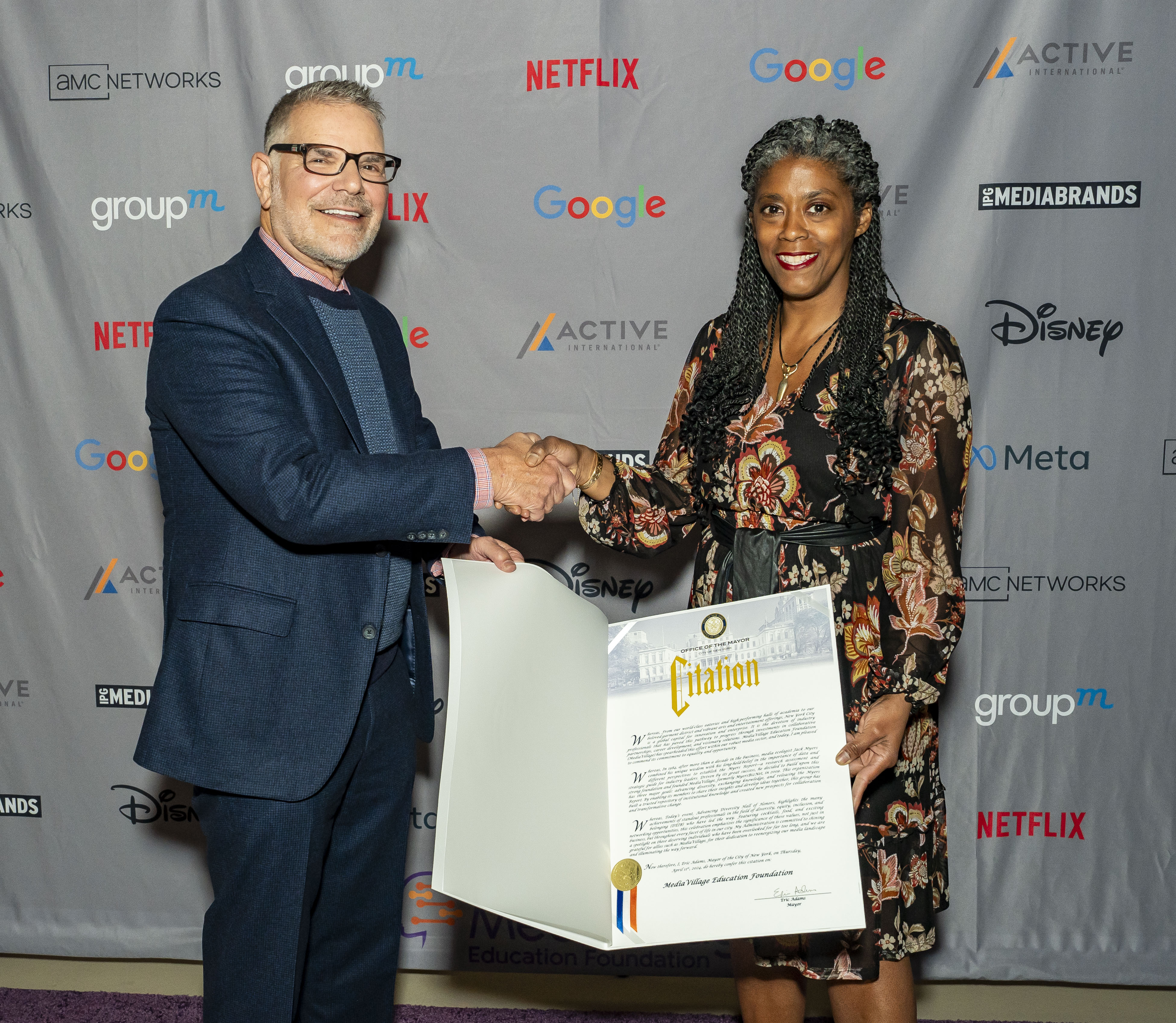Part of the evening included Alia Jones-Harvey (pictured below with Jack Myers), Associate Commissioner of Workforce Development and Educational Initiatives for the NYC Mayor's Office of Media & Entertainment, presenting Myers with a citation from Mayor Eric Adams. The citation read in part: "Advancing Diversity Hall of Honors highlights the many achievements of stand-up professionals in the field of diversity, equity, inclusion, and belonging, who have led the way. This celebration emphasizes the significance of these values not just in business, but throughout every facet of life in our city. My administration is committed to shining a spotlight on those deserving individuals who have been overlooked for far too long. We are grateful for allies such as MediaVillage for their dedication to reenergizing our media landscape and eliminating the way forward."