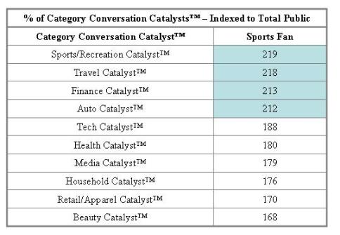 Our research also shows that sports fans are two-thirds more likely than the average American to be word of mouth influencers, or what we call Conversation Catalysts™. Sports fans also greatly over-index against average consumers in their propensity to be category-level influencers in many areas, most notably in the sports/recreation (index = 219), travel (index = 218), financial (index = 213) and automotive (index = 212) categories.