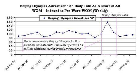 Looking at data from the Beijing Olympics only bolsters the idea that the Olympics provide a potentially huge payday for advertisers. One major advertiser had a 26% increase in projected weekly branded conversations from before the Beijing Olympics to after, which translated into an additional 53 million weekly conversations for that brand.