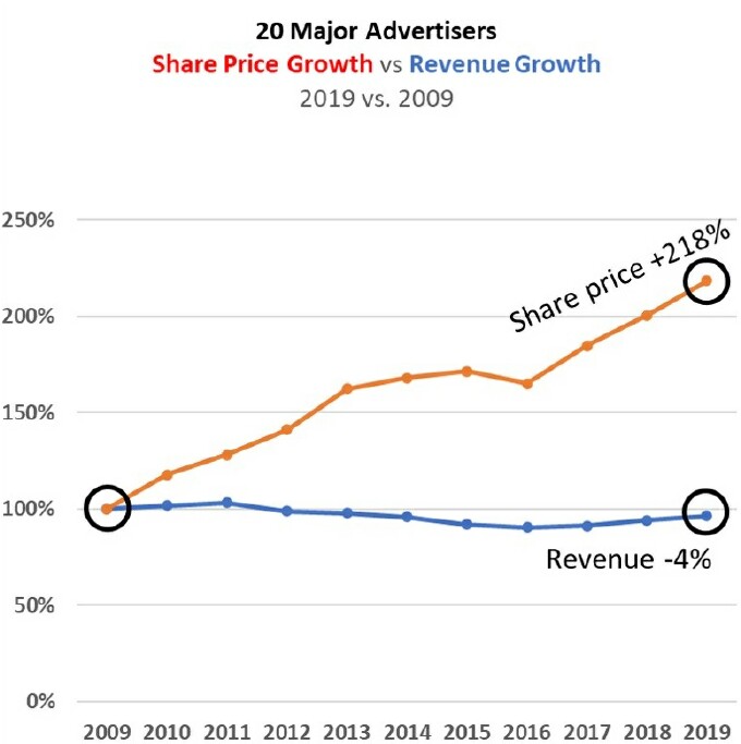 The decade of 2009 to 2019 was sandwiched between the 2008 financial crisis and 2020’s COVID pandemic. It was marked by a remarkable weakness in advertiser sales / brand growth, but advertiser share prices grew astonishingly. Share prices of these 20 top advertisers more than doubled during the decade despite their 4% decline in sales.