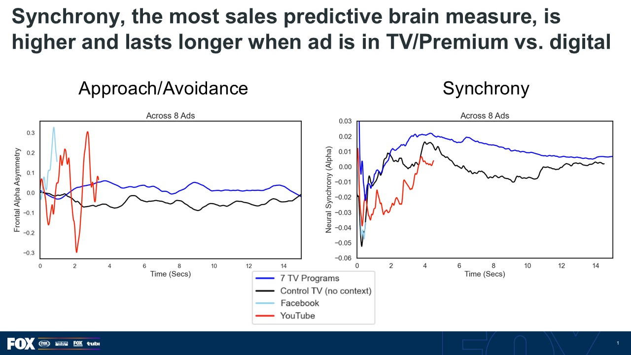 The most recent work has been done by Wharton Neuroscience and BHC, sponsored by FOX. It focuses on the most sales-predictive measures at the industry’s disposal, three specific patterns of brainwaves that have prediction scores (Adjusted R Squared) of .8 to .9 (memory, approach, synchrony). These waves tend to be higher and last much longer for TV than for digital as shown in this slide: