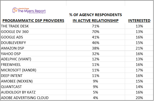 Among the 25 leading demand side programmatic advertising providers serving the advertising-supported media business, only 14 have been identified as business partners by a sufficient base of media agency partners to appear to have sustainable business growth potential, based on an analysis by The Myers Report. The analysis is based on data provided by 662 media agency programmatic professionals responding to the 2023 Survey of Media Agency Decision-Makers and Influencers and is based on the percent of respondents identifying as being in an active established relationship with each company. The companies, in order of active professional relationships, are listed below including the percent of additional respondents stating their interest in learning more about each company. The Trade Desk and Google dominate the programmatic marketplace, with Amazon DSP and Yahoo DSP the primary contenders for growth. DoubleVerify, as a security resource, is positively valued.