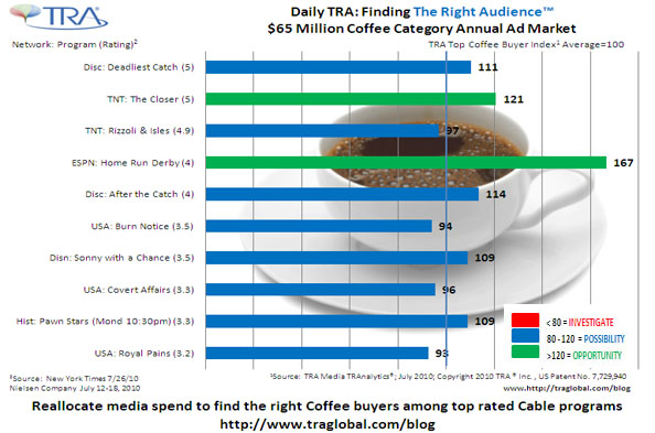 Coffee advertisers and the media companies can now move from valuing programs on the basis of ratings alone to the ability to quantify the value of an audience using actual consumer purchase behavior for the specific class of buyers with whom the advertisers are seeking to share their message. TRAs index of top Coffee category purchasers indicates that while the ratings for these Cable programs range from 5.0 to 3.2, the ratings index for the category buyers is as high as 67% better for ESPN’s Home Run Derby Knowing the true value of each environment will help advertisers optimize their return on their media spend and will help media companies prove value.