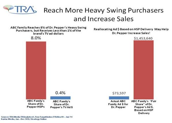 Dr. Pepper has an opportunity to reach more of its Heavy Swing Purchasers by considering a change in its investment on ABC Family network – thereby increasing the return on this investment. ABC Family delivered 8% of Dr. Pepper’s Heavy Swing Purchasers in 2010, but received less than 1% of Dr. Pepper’s advertising dollars. A budget reallocation might be just what the doctor ordered!