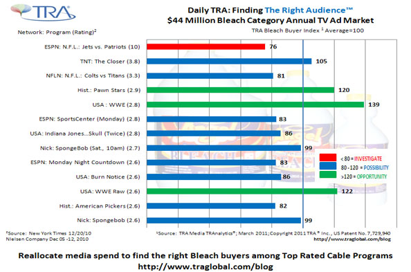 Knowing your audience is not enough, reaching them is everything. Now with TRA’s patented Media TRAnalytics®, advertisers are able to find The Right Audience™ to improve their ROI. TRA matches viewership with purchase data in the same households so, as in this example – purchasers of Bleach products are able to be found by the Advertiser. Armed with this vital information, advertisers are now able to gear specific messages to specific audiences, thus eliminating wasteful media spending on audiences who may never buy the product. Why waste resources when it’s avoidable? Contact www.traglobal.com to find out more.