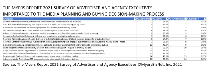 The Myers Report 2021 Survey of Advertiser and Agency Executives confirmed overall advertiser/agency alignment, uncovered several surprises, and suggests some agency priorities are less important to their clients. The study conducted online earlier this year among 464 agency and 236 advertiser professionals, suggests that media company investments are not always in sync with the priorities of their clients -- both agency and advertiser. Respondents were asked to rank the importance of each attribute to their media decision-making process (0-10 with 10 = most important, 0 = not at all important). Results are based on the percent of respondents rating each attribute on a score of 8, 9, 10 (top 3 box)
