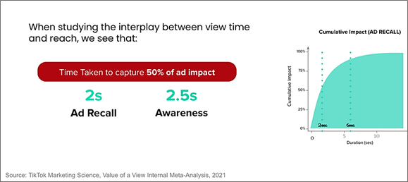 Specifically, for TikTok, research conducted by its Marketing Science unit suggests 50% of the impact from a TikTok ad is realized in the first 2 seconds, and the first 6 seconds captures 90% cumulative impact on Ad Recall and around 80% for Awareness4. Moreover, the longer videos continue to play, the audience size tends to decrease. Marketers should be aware of the unintended consequences and tradeoffs between viewing duration and reach, as well as cost per reach. So, more is not always more.
