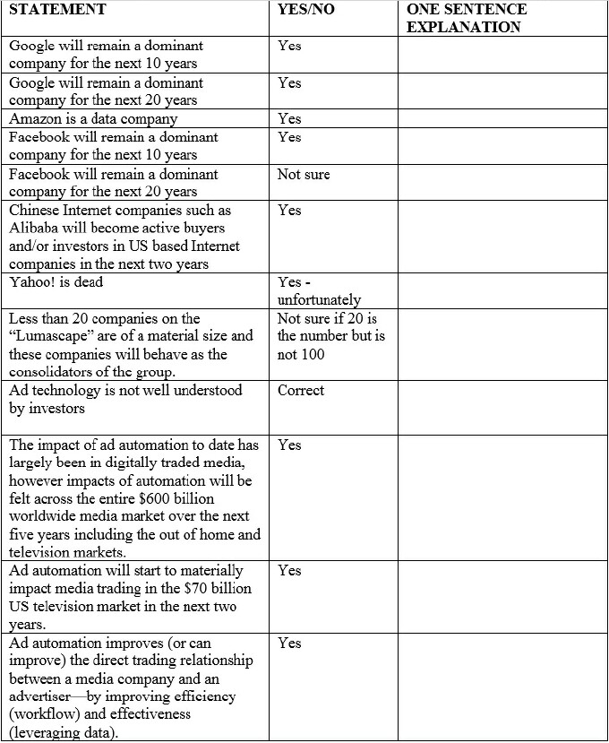 RASKO: I don't agree with this statement because I take a macro view. There are many other major companies, albeit some of them smaller market-cap wise that are big enough to compete with these two. Verizon, AT&T, Disney, WPP, Time Warner and Charter on the cable side; in many cases Google and Facebook have gotten big enough to compete with those guys. In the end the next phase of the media company competition is only beginning keep an eye on the connectivity to the consumer wallet that telco has as the next frontier.