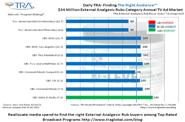 Mike and Molly, CBS’ new sitcom is a sure-fire hit with purchasers of External Analgesic Rubs. What does this mean for advertisers of this type of product? While spending on TV ad campaigns to capture the age and sex demo target, advertisers are incurring a huge cost while likely missing some of the purchasers who would buy the product. The chart below demonstrates how the top rated broadcast programs for the week of Feb 14th indexed with respect to purchasers of External Analgesic Rubs – one, Mike & Molly, stood apart from the rest. In fact, the lowest ranked program for the week ranks highest when it came to people actually going out and purchasing the product. Using this information from TRA’s Media TRAnalytics®, advertisers are eliminating the pain involved in planning their ad campaigns because they now know exactly who their audience is and exactly where to find them to maximize the return on their investment.