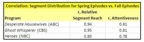 Correlation in these charts is high, as we would expect. Both Relative Segment Reach and Attentiveness tend to be similar by genre segment for spring episodes and fall episodes of the respective shows. The table below illustrates these high correlations: