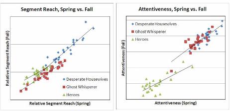 Finally, the two charts below plot Segment Reach and then Attentiveness for spring and fall, with each point representing a genre segment. All six trendlines are at around a 45 degree angle, further indicating the high correlations.