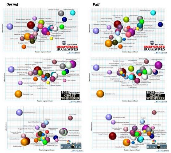 To examine genre preferences and whether they change over time, we selected three programs that aired in the spring and are now continuing in the fall: Desperate Housewives (ABC), Ghost Whisperer (CBS), and Heroes (NBC). We then created two bubble charts for each program. The chart on the left is based on April/May viewing habits, while the one on the right is based on September/October viewing habits.