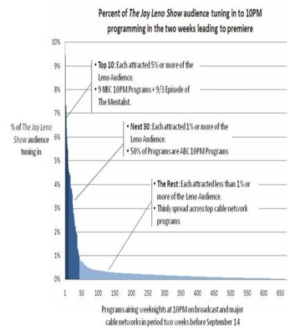 The first chart reveals television's emerging long tail. The chart shows the percentage of the Leno audience that watched any of 650 different programs airing at 10PM on weeknights across broadcast and major cable networks in the weeks of August 31 and September 7, ranked in descending order by the percentage of the Leno audience that tuned-in.