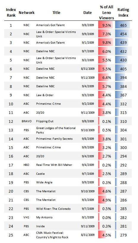 The top 8 programs by Rating Index are, as one might expect, NBC programs. The audience that had tended to watch NBC at 10PM continued to watch after Leno premiered.