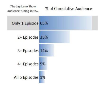 The degree of loyalty to The Jay Leno Show is similar to observations of loyalty to other programming: low. The chart below examines viewer loyalty to Leno at 10PM. Of the viewers who watched any of the Leno Show during the week of September 14, a majority, 65%, tuned in to one episode. Only 5% of Leno viewers tuned in four times in the program's premiere week.