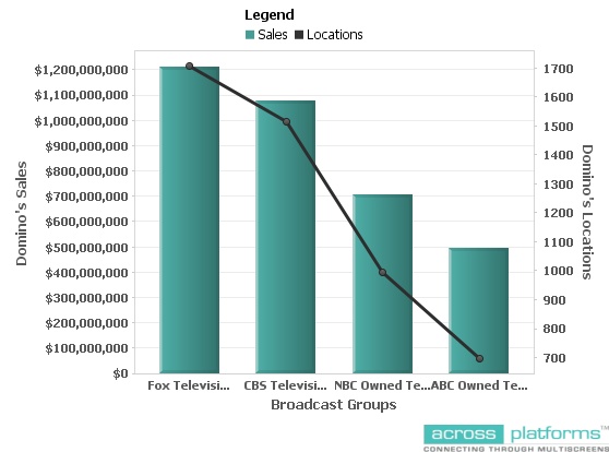 With 21 owned and operated TV stations, Fox Television Stations broadcasts to more than 1,700 Domino's locations. When calculating the retail sales of these "FOX Television Stations" Domino's locations, it equates to approximately $1.2 Billion in retail sales last year. Click for Interactive Report