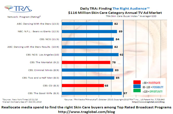 Ask any advertiser what their main objective is and the answer would almost always be to maximize revenue for their products or services. With that in mind, advertisers of Skin Care products should pay heed that most of the Top 10 Rated Broadcast Programs for the week of Sep 27 – Oct 3rd were not a great place to reach their category buyers. Reallocating their media spend to programs with a higher than 120 index among their purchaser audience would eliminate wasteful spending and maximize return on their investment. By using TRA’s patented Media TRAnalytics®, advertisers now have the help they need to make the right choices – that is, the right programs, at the right times, with the right message – to get them the right results… maximum profits. Considering that skin care advertisers spent $116 million in 52 weeks of advertising, eliminating wasteful spending with these new information – understanding the audience who is viewing the programs, could have a significant impact on bottom line results.