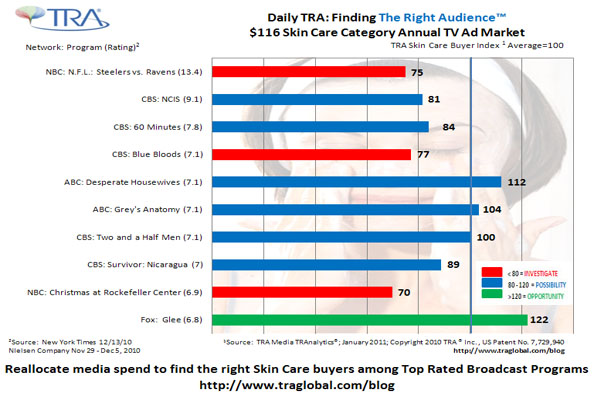 Viewers of Glee, with its fresh faced young actors, indexed the highest for buyers of Skin Care products among the top rated Broadcast programs for the week of Nov 29th. For advertised brands of Skin Care, finding The Right Audience™ means finding the programs that deliver a high concentration of their purchasers. Using TRA’s patented Media TRAnalytics® helps advertisers and their agencies fine tune their media planning and buying so they can improve product sales.