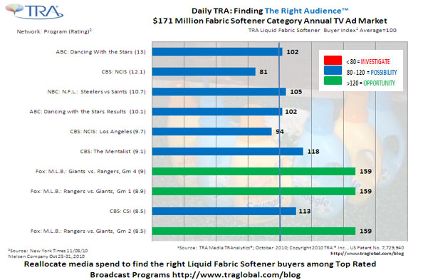 Everyone loves the smell and feel of laundry fresh out of the dryer. Towels and sheets that are as soft as baby’s skin are wonderful. Soft sales impact from your media plan however will make you cry like a baby – and rightly so. Now you can know and improve the product sales impact of your television media with TRA’s patented Media TRAnalytics® system that helps you find The Right Audience™ for the products you want to sell. Proven case studies done by TRA and advertiser clients demonstrate the power of Purchaser Targets above and beyond the traditional age/gender demographic targeting. Learn more about how you can tumble your media investment on the high spin cycle with TRA so your media plans come out smelling and feeling ready to be embraced by all.