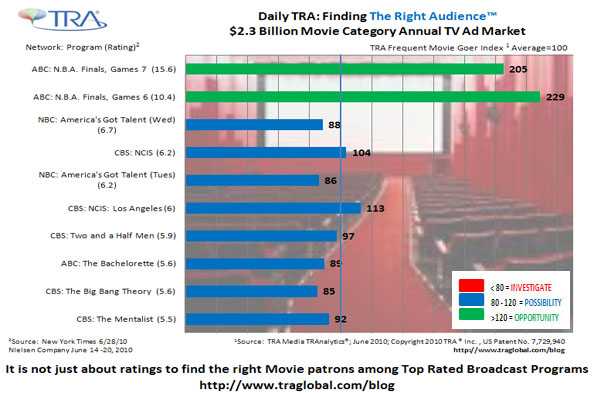 Want to tackle the most likely moviegoers/box office patrons? Look no further than the couch on game day for the best audience for your feature film ad message. While sporting events often showcase the movie celebrities in the fan audience, today’s DailyTRA shows how, while most Americans enjoy going to the movies, the audience for sports events on TV are big fans of movies too. Whether it is the NBA finals or the World Cup of Soccer, millions of viewers have one thing in common - they tend to go more often to the movies. With TRA’s patented Media TRAnalytics®, you can now tailor your motion picture media spend to get the right message to ‘The Right Audience’, which in this case is the regular moviegoer.