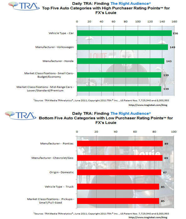 Pride yourself on being cutting edge? Advertisers spend years of research and development to roll out new products with new packaging and increased media spends, yet they continue to get and accept the same old underachieving ROI. What is wrong with this picture? Some would say that some advertisers are afraid of veering away from plain old ordinary ratings as the “tried and true” metric of currency. Well, we’re not asking advertisers to replace their security blanket, even if it’s making them throw good money after bad, we’re asking that they use their media spend smartly. It’s the responsible thing to do. With TRA’s Media TRAnalytics®, we’re arming advertisers with the information they need to make the best decisions for their products. That is, which networks, programs and dayparts will give provide The Right Audience® for their brand. This means advertisers are able to know where to find their brand loyals, their competitors’ loyals as well as many other desired targets like lapsed buyers, triers, and repeaters on Television. For example, below are the top five and bottom five auto categories for the FX program Louie./i>Advertisers such as Honda, Volkswagen and other small and mid-range car manufacturers wanting to increase their ROI should consider Louie as a program to reallocate their media spend. For more information on TRA, please visit www.traglobal.com.