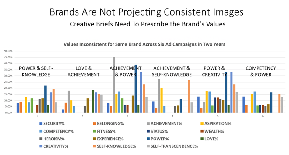 How can RMT deduce these motivations and need states (need states are subsets of motivations) from this ad? RMT goes far deeper, to 265 psychological dimensions distilled by AI and ML (machine learning) from every word in the English language, validated to be predictive of brand choice in every product category by Simmons. Need states are specific clusters of these 265 Value Signals, and the need states cluster into the 15 motivations.