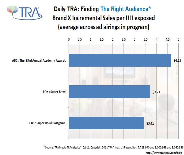 With such a steep price tag for these events, advertisers want to know that they’re getting a return on their investment. TRA has tools that can help advertisers to measure the impact of advertising during these big-ticket live programs, as well as during run-of-the-mill programs. For example, Brand X is a CPG brand that advertised on both the Academy Awards and on the Super Bowl in February 2011. A TRA Media TRAnalytics® ROI Report shows the incremental Brand X sales generated among households exposed to Brand X’s ads during these two events. While the Academy Awards had a smaller audience than the Super Bowl, it was generating more sales for Brand X.
