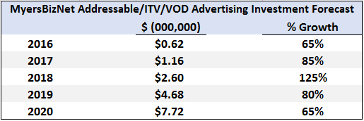 As marketers and agencies shift their media buying priorities from awareness-focused cost efficiencies to results-oriented performance measures based on sophisticated data and analytics, there will be an inevitable and rapid shift to highly targetable addressable opportunities. Based on this combination of factors, MyersBizNet is forecasting exponential growth for the category.