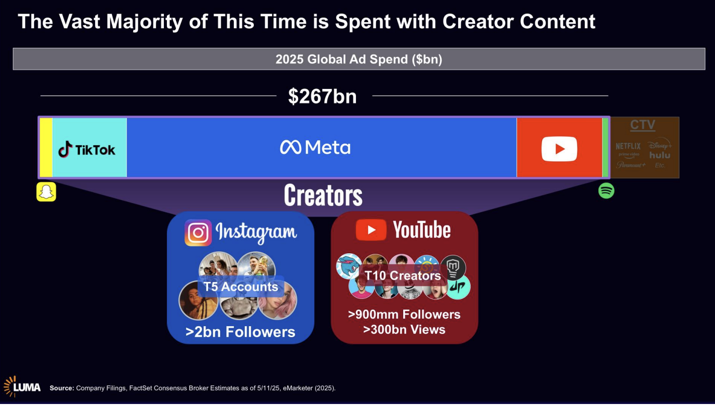 While creators dominate screen time, they're not getting ad dollars to match. According to Luma Partners’ State of Digital 2025, global ad spend will exceed $267 billion, yet influencer marketing is projected to bring in just over $20 billion -- less than 8% of total spend . This isn’t just a gap--it’s a $45B media arbitrage opportunity disguised as an overlooked channel.