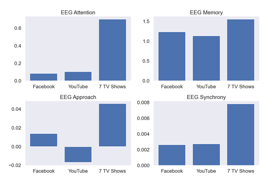 And yet, Wharton Neuroscience, in a study sponsored by FOX with Bill Harvey Consulting found that the effects of shortform digital video on neuro measures known to strongly predict sales effects are nowhere near as strong as television, whether linear or streaming. Whereas television ads on average cause the brain to exhibit approach/attraction signatures, ads in shortforms on average cause the brain to manifest avoidance signatures.