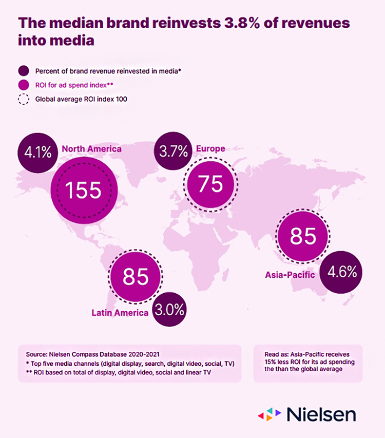 A Nielsen report of industry changes based on 150,000 observations notes that half of all brands studied are underspent and only 25% are overspent – half of all brands studied not achieving the ROI they could if they spent more.