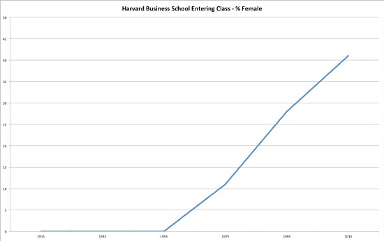 Most of our waking hours, whether male or female, take place at work. A creature of the business world, the workplace is where my mind first ran in the research for my forthcoming book, The Future of Men: Masculinity in the Twenty-First Century. And, indeed, business school is an interesting microcosm of these macro-trends. Harvard Business School was founded in 1908. It didn’t admit women until 1962. The class of 1975 was 89% men. That is, it took 13 years for women to become 11% of the entering class. By 1995, women comprised 28% of HBS’ entering class. Women comprise 41% of HBS’ 2015 class. We like graphs in business. Here’s what this looks like: