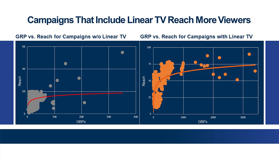 - Nielsen ONE analysis by FOX shows that at 350 GRP, a campaign without linear TV will tend to top off its reach at 20%, vs. 75% with linear TV.