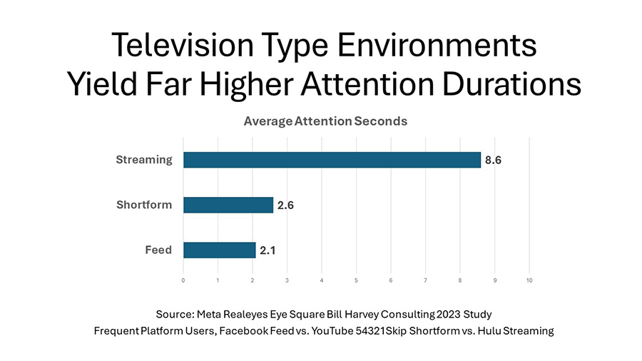 - Ads on TV average ~15 seconds of attention for 30s and ~8 seconds for 15s vs. 1-2 seconds in scrolling digital or 5 seconds for YouTube 54321Skip where most of the 5 seconds are looking at the Skip button.
