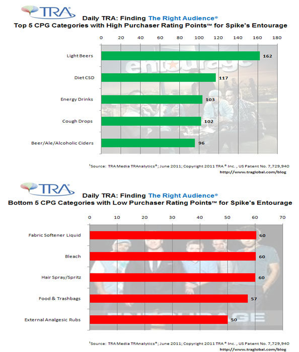 The show, made popular by HBO about four buddies from Queens, NY in search of fame and fortune that leads them to tinseltown aka Hollywood , also found a home on the popular network, Spike TV. Advertisers wanting to see what viewers of Entourage are purchasing are just a few clicks away from finding out, using TRA’s Media TRAnalytics® StoryFinder™ report. In this case, Light Beers, Diet Carbonated Soft Drinks (CSD) and Energy Drinks rank among the highest in terms of Purchaser Rating Points™ for the program. StoryFinder ™ also provides advertisers with vital information such as which categories indexed lowest for the program. For Entourage, household products such as Fabric Softener, Bleach and Food/Trash Bags would do well to not waste their media spend on this program. With this information, advertisers are able to streamline their media buys to eliminate any unnecessary wasteful spending by reallocating their media spend to programs that provide them with a higher return on investment. Networks are also using StoryFinder™ to know exactly which advertisers would benefit the most from advertising on their programs. To learn more about TRA, please visit www.traglobal.com.