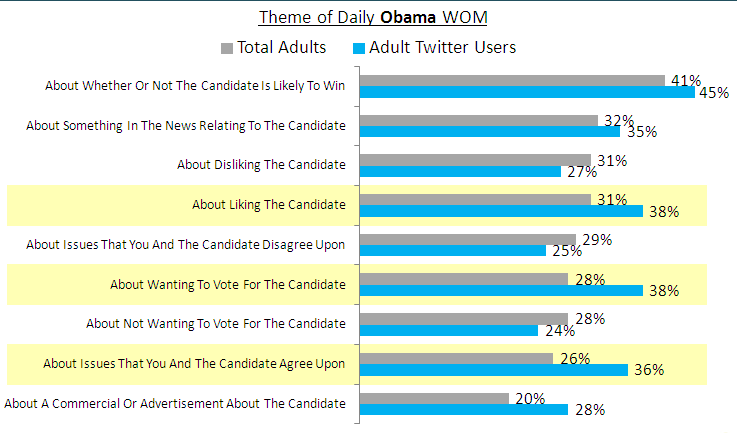 My firm tracked word of mouth throughout the 2012 election in partnership with the National Journal, picking up both the 90% of word of mouth about the election that took place offline, as well as what was being talked about online via social media, texting, and so forth.
