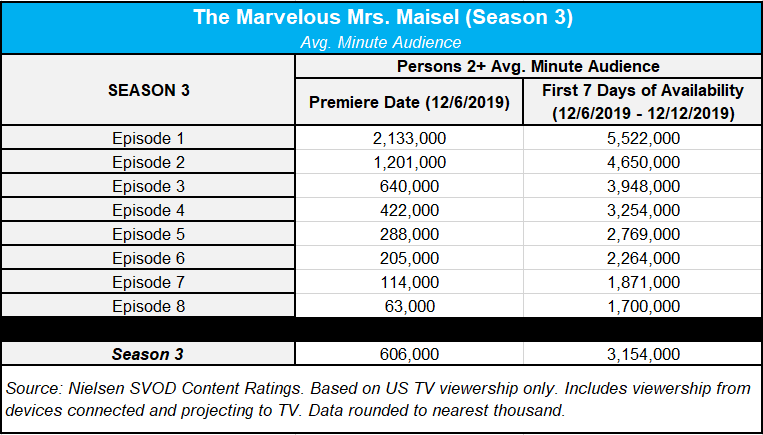 When looking at average viewership by day, Season 3 of Mrs. Maisel had an average minute audience of 3.2 million viewers across its first seven days, surpassing the audience numbers of Season 2, which were just under 2 million.