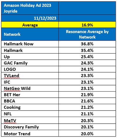 There are a total of 598 programs on US television which score over 30.0% in resonance with this ad. 30% resonance level was detected by a 605 study involving over 20 million households of set-top box data and over 23,000 completed interviews to be the level at which even a single ad exposure can generate strong first brand mention, brand perception, brand consideration, and purchase intent.
