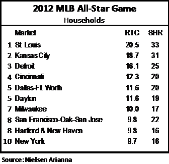 Within those metered markets, host DMA Kansas City delivered the second-highest rating for the game, with an 18.7 Household rating. The only market to top that was nearby St. Louis with a 20.5 rating. Geography only played part of the role here, however, as the manager of the National League squad was Tony LaRussa, who retired as manager of the St. Louis Cardinals at the end of last season, after guiding them to a World Series Championship.