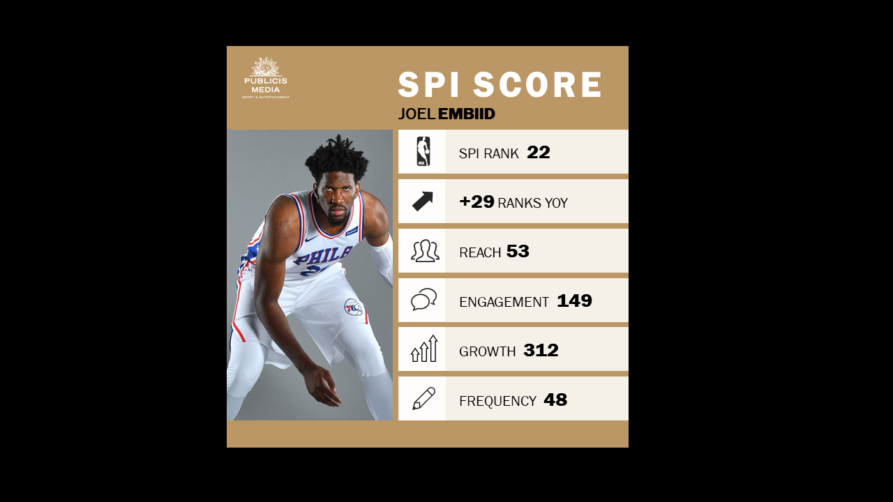 Interestingly, Embiid's popularity extends far beyond 76ers devotees, as roughly 98% of his followers do not identify as 76ers fans or even following the team on social media sites. In the most recent off-season, Embiid jumped a stunning 29-points in social rankings, compared to his 2016 metrics, providing another indication of his growing global presence.