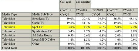 Very much countering the trend of national advertisers as regards spot television, of late they have been increasing their use of spot: +26% in the first quarter of 2021, for example, and the spot TV percentage has been increasing since 2017.