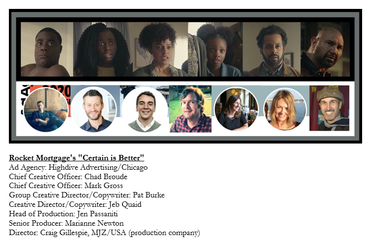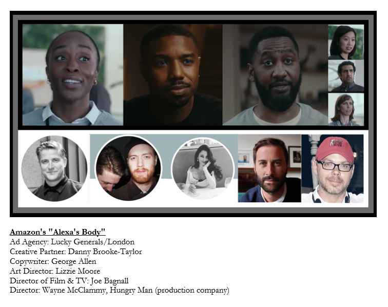 In order to better visualize the data, I've placed screen shots of the spot's on-camera talent above the headshots of the creative team (in order of seniority from left to right) along with the roles and names listed in the credits posted on Source Creative: