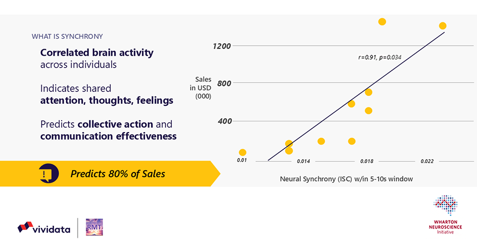 Wharton Neuroscience was the first to demonstrate that EEG synchrony strongly predicts the incremental sales effect of advertising, with an unmatched 0.91 correlation (and R Squared of 0.82). By comparison, the strongest correlation of other known predictors is the 0.48 R Squared reached by RMT Motivations, which was found to have this level of relationship with IRI sales by the Advertising Research Foundation Cognition Council.