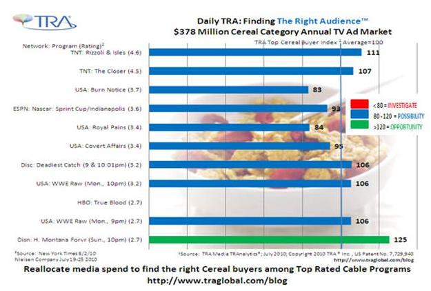 Based on ratings,the top ten Cable programs ranged in overall household ratings from 4.5 down to 2.7. TRA (see chart) indicates that six of these programs holds higher value for cereal advertisers, with indices of heavy cereal purchaser ratings going up to 125. From TRA’s Media TRAnalytics® you can learn about programs with more targeted appeal (lower ratings, i.e. not in the top ten) often have even higher indices against specific purchaser targets. For example, among all cable programs with at least a 0.1 rating, there are 304 cable programs with cereal heavy purchaser indices of 125 or higher, 65 of which have indices over 200. The highest index is for ESPN2’s “Outside The Lines” with 604.