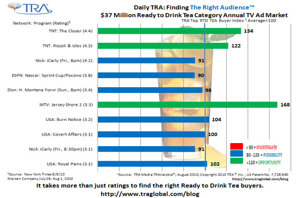 Shown below are three top rated cable programs, TNT’s The Closer and Rizzoli & Isles and MTV’s Jersey Shore, that offer both high ratings and a highly concentrated audience of Ready To Drink Tea buyers. Now that all those political ads are no longer cluttering the airwaves, you can attack your competition by finding The Right Audience™ with TRA.