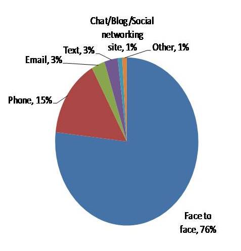 The overwhelming majority of word of mouth about brands takes place offline (90+%), while less than 10% occurs online. Further, less than 2% of word of mouth takes place via blogs, chatrooms, or social networking sites; the remainder of online WOM is via e-mails or texts people send to each other.