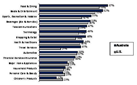 Like the U.S., the categories where Australians engage most often in word of mouth are food/dining, media/entertainment, and sports and recreation. In each case, a larger proportion of Australians have daily conversations than Americans. In fact, Australians engage in more word of mouth than their U.S. counterparts in a number of categories – with the sharpest differences coming in travel services and shopping/retail.