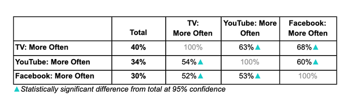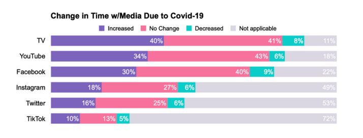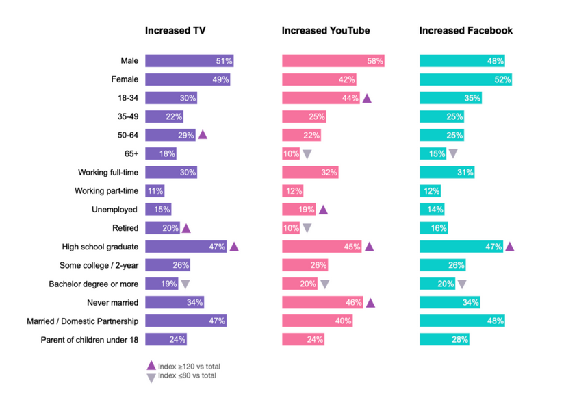 We see slight demographic differences in consumers who have increased usage of one platform vs another. People of all age groups have increased time with TV, but the increase is highest among 50-64 years of age. Increased time on Facebook is higher among people under 65, including the 18-34 year old who were “supposedly” leaving Facebook. The increase in time spent watching YouTube skews somewhat younger, male, and more likely to be unemployed. People with higher education are less likely to have changed their time spent with any of these media.