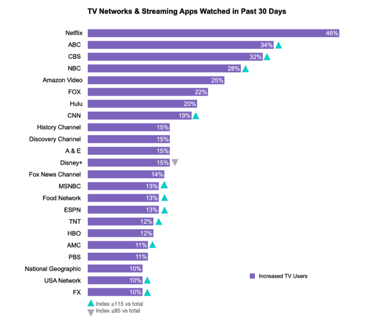 Increased TV users over index for watching all day parts and especially for weekday morning 7am-9am (index 134) and weekdays 9am-4pm (index 131). They watch network TV, news networks, cable mainstays and lifestyle channels. It will be interesting to see if networks aligned with News (i.e., ABC, CBS, NBC, CNN) see a decrease in the coming weeks post election. These consumers are neither more nor less likely to use the major streaming apps (i.e., Netflix, Amazon Prime, Hulu, Disney+), where they over-index is for live TV.