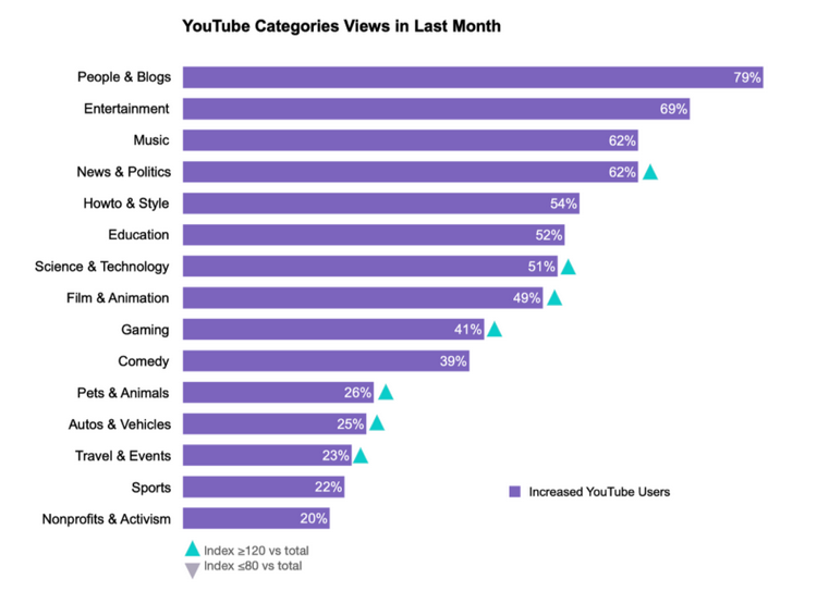 Increased YouTube users are 77% more likely to watch YouTube multiple times per day than general users. They’re spending their time on YouTube watching all kinds of content from News & Politics to Pets & Animals. Important to note, this data is for A18+ and does not include kids.